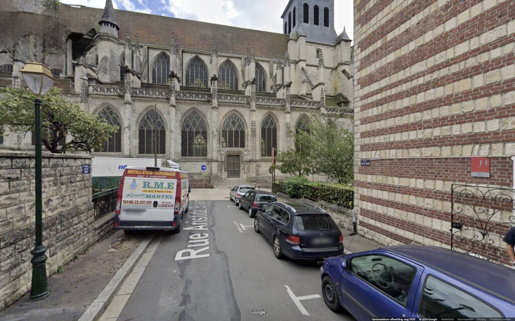 Ik heb in ieder geval de juiste titel van het werk, de handelaar noemde het ‘straatje met zicht op een kerk’. Het is duidelijk waar de foto is genomen: Lisieux in Normandië. Demachy woonde zelf in Hennequeville slechts 35 kilometer van Lisieux. Ja en dan ben ik wel zo nieuwsgierig om te achterhalen welke kerk het is en hoe het straatje heet. Google Maps!