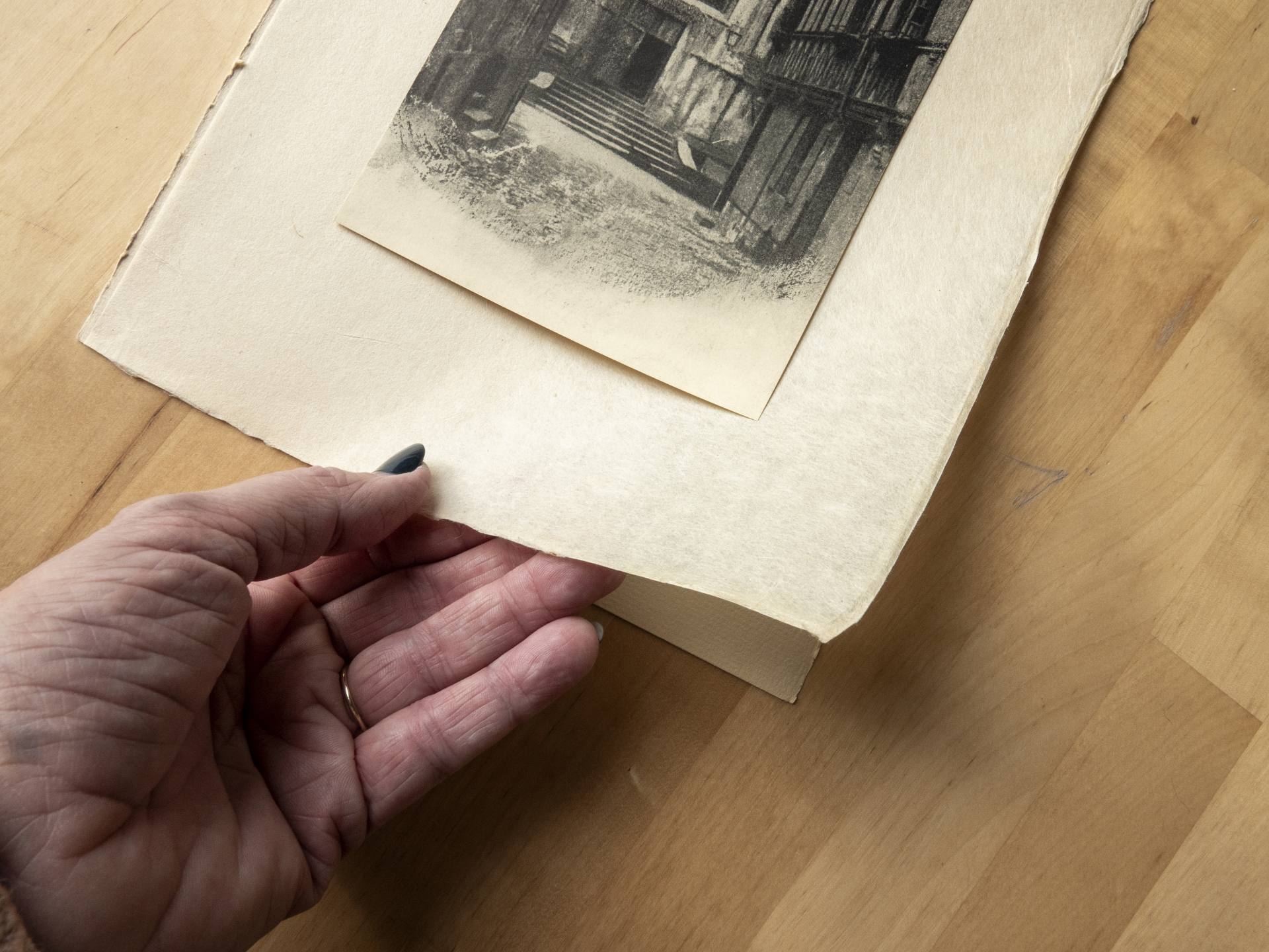 Nu even terug naar mijn aankoop, een foto gemaakt door Robert Demachy. Maar er is wat vreemds aan. De foto is op een papieren blad geplakt met daartussen nog een soort van vloeipapier. Het steunblad heeft een formaat van 30×22 cm en de afdruk zelf is 21×12 cm.