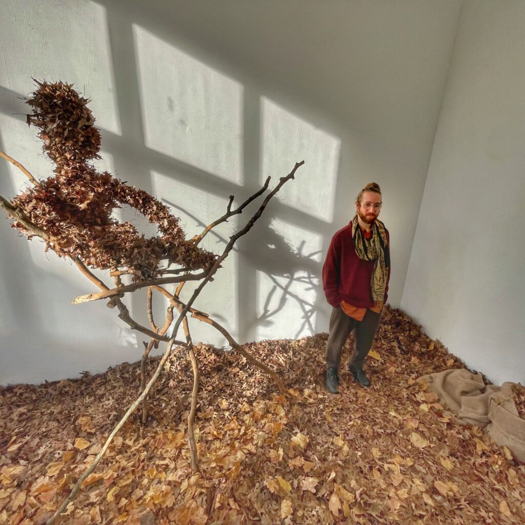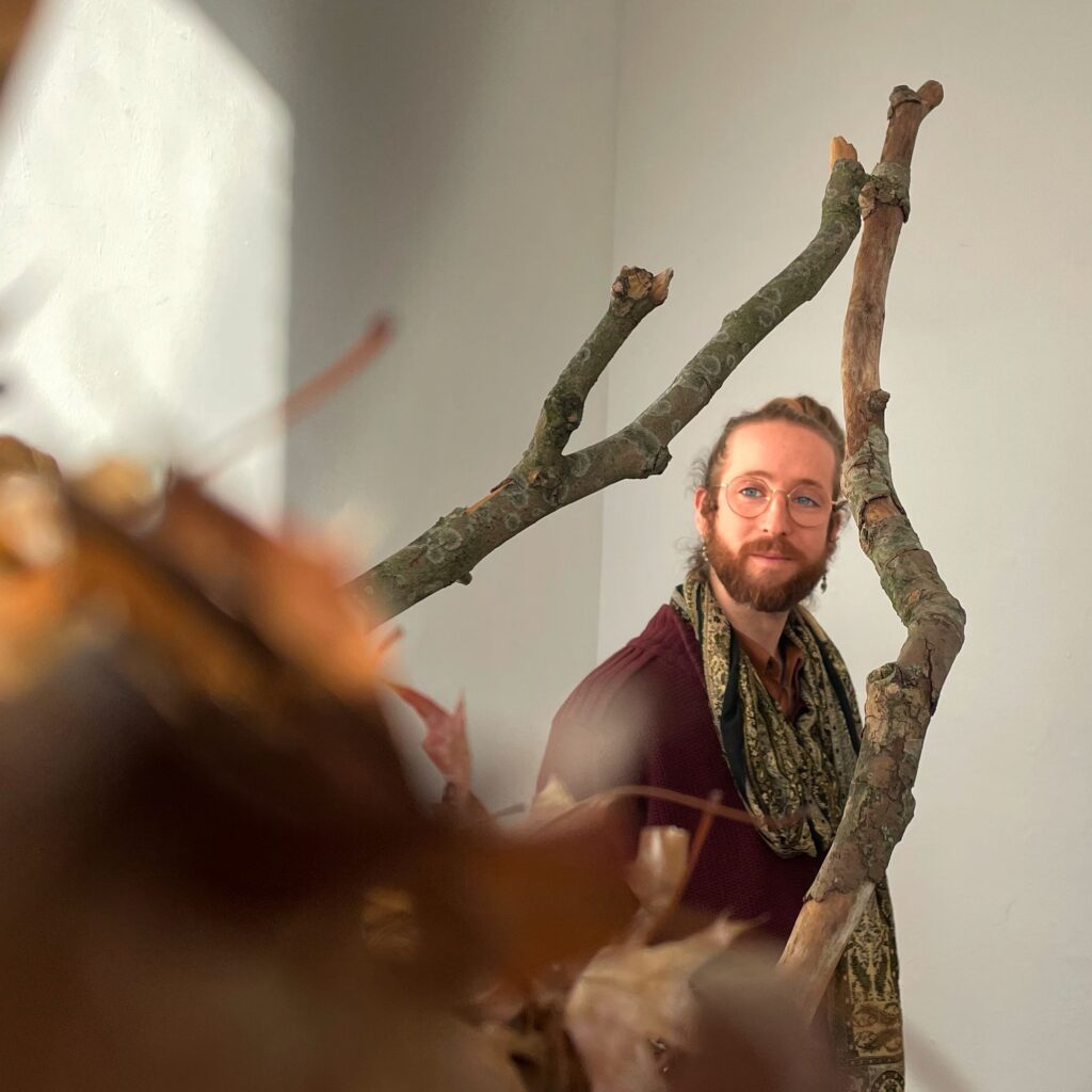 In Kunstpodium T toonde Roeland Rooijakkers een installatie waarin aarde, mos en schors ademen. Hij werkt met materialen die al eeuwen bestaan — takken, stenen, bladeren, zand — alsof hij in gesprek is met wat ouder is dan wij.