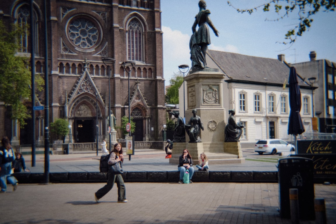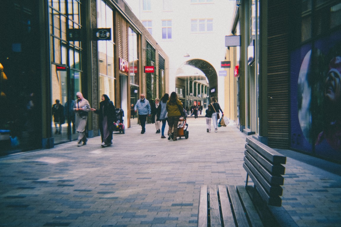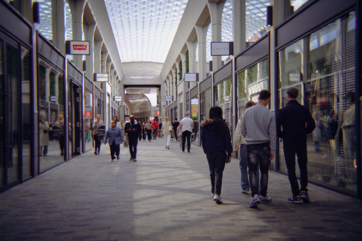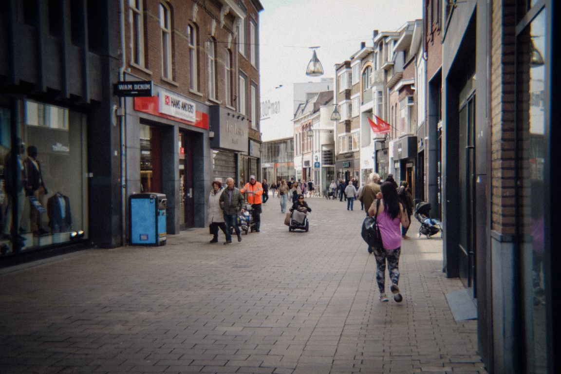 En toen was het tijd om er echt mee op pad te gaan. Wat voelde mijn camera ineens heerlijk licht en luchtig zonder die zware lens erop! Ik besloot een paar uurtjes shoppen in het centrum van Tilburg te combineren met wat fotografie. Terwijl ik tussen de kledingrekken snuffelde, bungelde mijn ‘retro setje’ nonchalant om mijn nek. Oké, in de paskamer moest hij even af, maar verder hoorde hij er helemaal bij. Op straat maakte ik af en toe een foto — bijna ongemerkt, want zonder opvallende lens keek niemand vreemd op. En zo had het winkelend publiek niet echt door dat ik hen decennia terugwierp in de tijd via een digitale sensor.